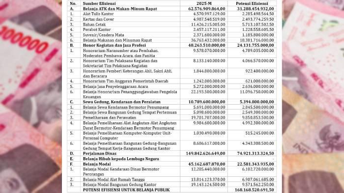 Efisiensi belanja daerah tersebut bersumber dari belanja ATK, belanja makanan dan minuman rapat, belanja honorarium kegiatan, belanja sewa, belanja perjalanan dinas, dan belanja modal untuk kebutuhan aparatur.